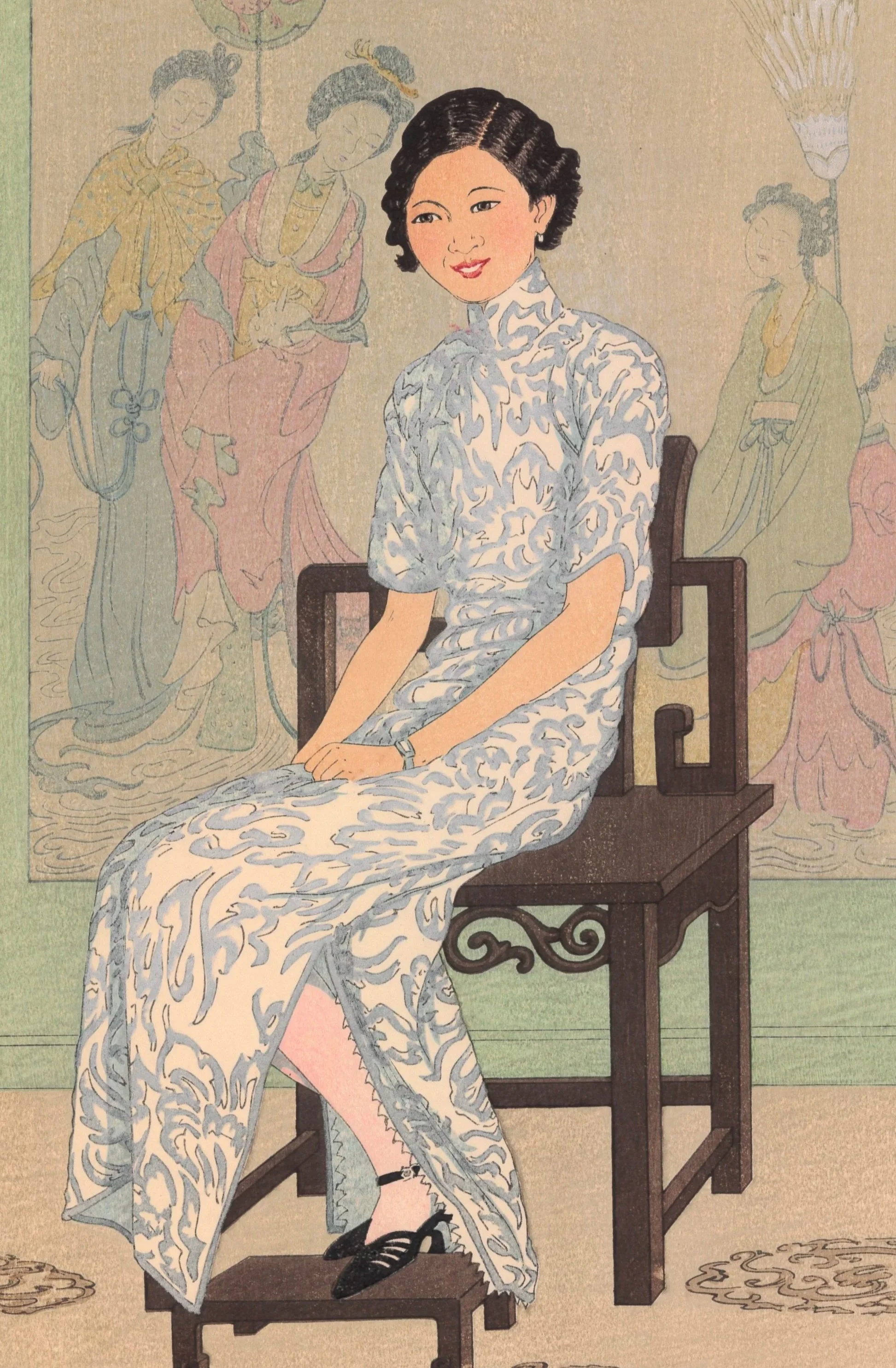 There are many wonderful things about this print by Elizabeth Keith. To begin with, it may be one of as few as 25 that were ever printed. The subject smiles right at you, posing elegently and confidently, with classic Chinese paintings behind her. No one knows who she is, but scholars believe this was a private commission for her family.