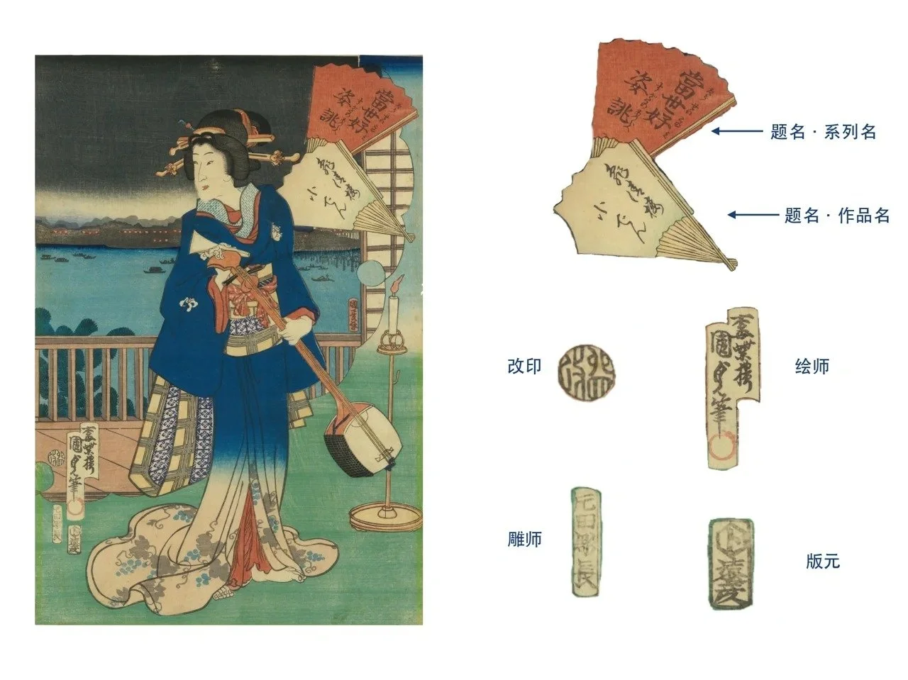 浮世绘在分类上属于“绘画”,但画面能传递的信息是十分有限的。为了提供更丰富的信息让读者了解画作,浮世绘上有着大量不同的文字作为辅助。有画作名称/系列名称、有画师署名、落款印章、版元印、雕师摺师印、改印、还有日期、和歌、题词等等。