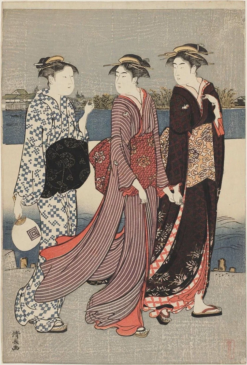 鸟居清长突破了这一限制。他笔下的美人身形变得更健美修长,头部和面部都比春信时期更大一些,这抹去了春信式美人的无辜天真感,增加了成熟妩媚的气质。画面场景的选项也变多了,美人开始走上街头,与场景产生更多的互动,在屋内的场景也增加了人物之间得互动,这就让清长的美人显得更加生动,有生活气息。荣之等画家都欣赏并模仿了清长式的画法,形成了早期美人画的第二支流,这一派更接近日常,也更有动态美。